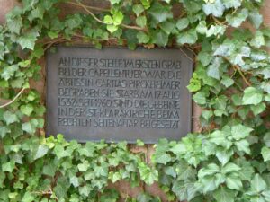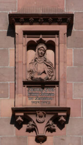 Gedenkplatte am ehemaligen Grab der Caritas Pirckheimer an der Portalfront der Nürnberger Klarakirche; Sol Octobris, CC BY-SA 4.0 https://creativecommons.org/licenses/by-sa/4.0, via Wikimedia Commons